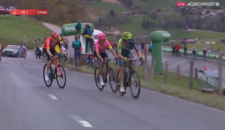 За 3 км до финиша из этой группы атаковал 23-летний немецкий велогонщик команды Bora-hansgrohe Флориан Липовиц (Florian Lipowitz), на колесо которому сразу сел Ричард Карапас, а затем к ним переложился и 23-летний испанский гонщик Карлос Родригес (INEOS Grenadiers). Через километр эквадорский гонщик контратаковали уехал в одиночку, а лидировавший в общем зачёте Хуан Аюсо (UAE Team Emirates) начал терять темп и время.